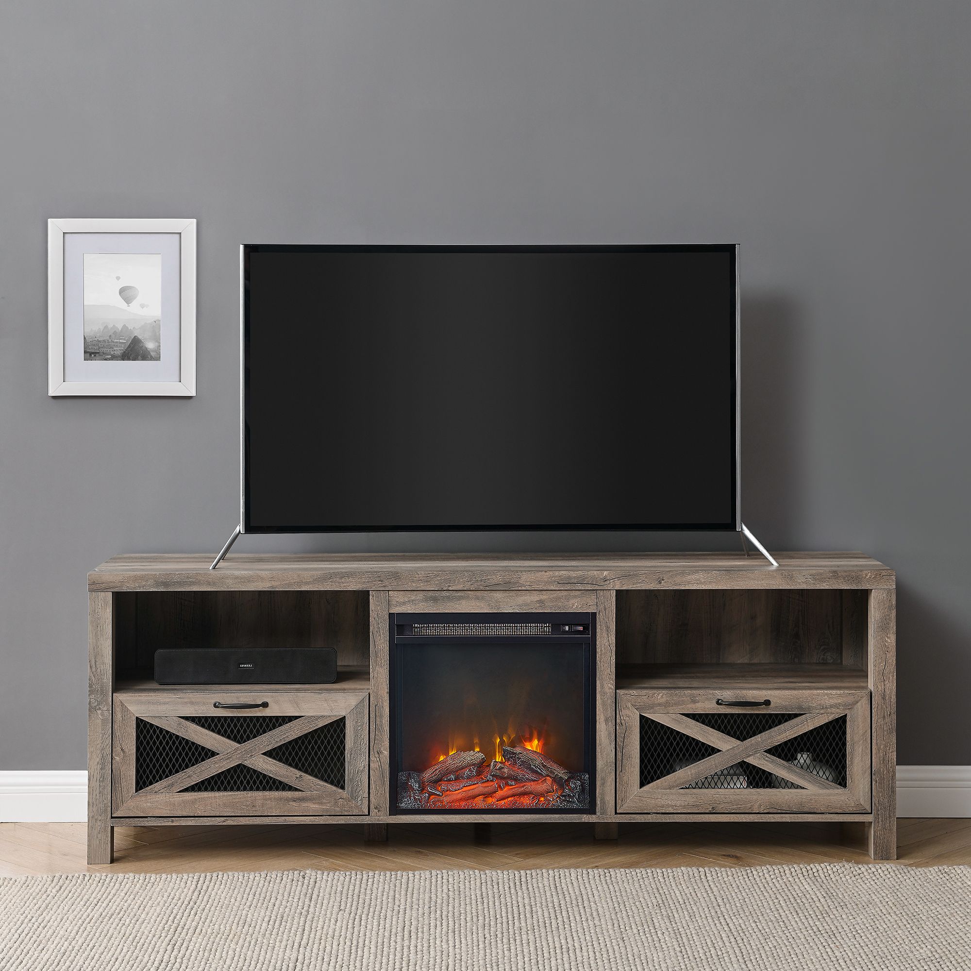 Walker Edison 60 Farmhouse Metal X Fireplace Console Grey Wash The Home Depot Canada